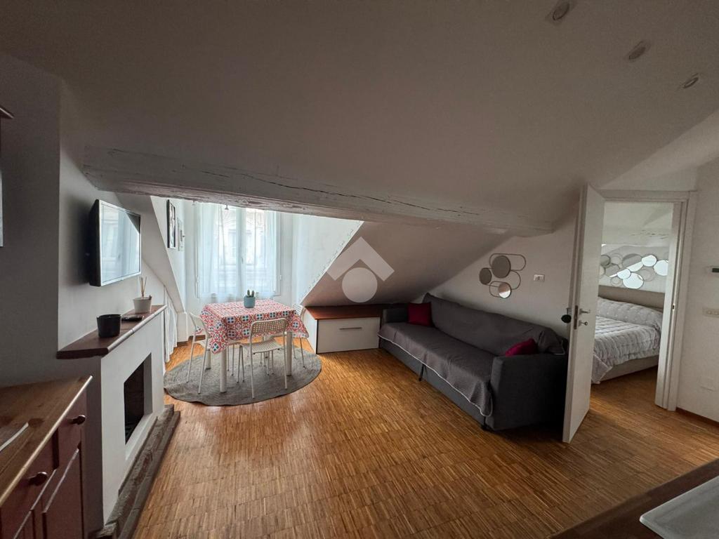 L'alloggio, con accesso da pianerottolo, si apre sulla zona giorno con cucina lineare, completa di divano, tavolo, sedie e tutti gli elettrodomestici. L'intero ambiente è reso molto luminoso per via della finestra, la quale si affaccia sulla meravigliosa via Garibaldi offrendo uno scorcio suggestivo su Piazza Castello. Troviamo dunque, sulla destra della zona giorno, la camera da letto, anch'essa luminosa per via della finestra con affaccio esterno, e l'ampio bagno finestrato con sanitari, doccia e lavatrice/asciugatrice.