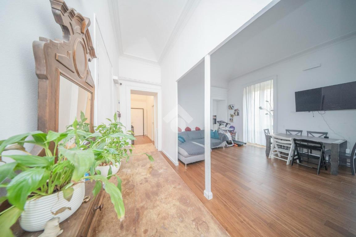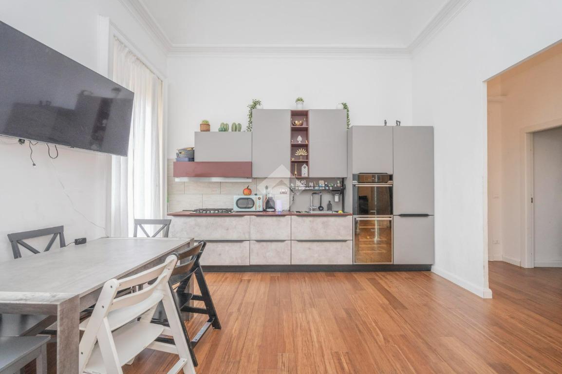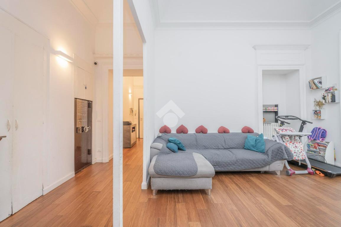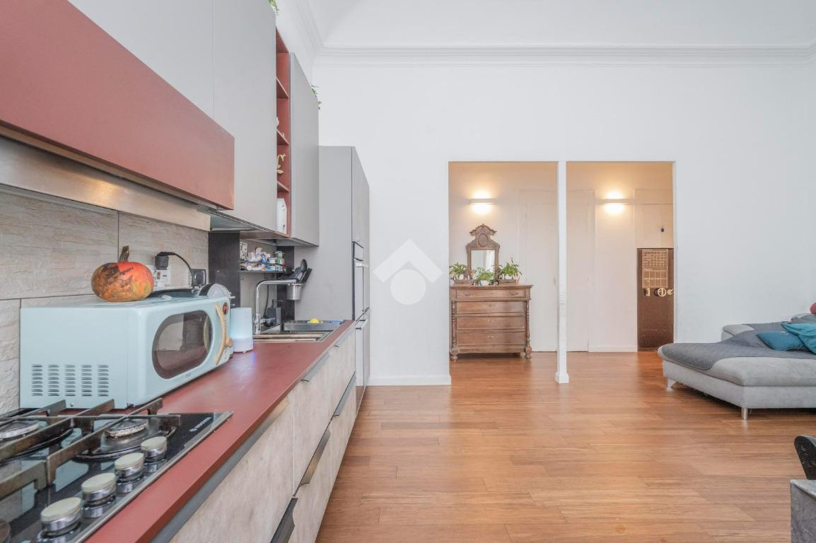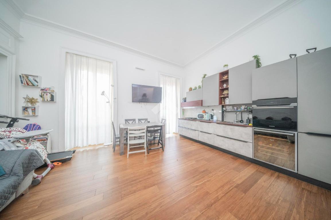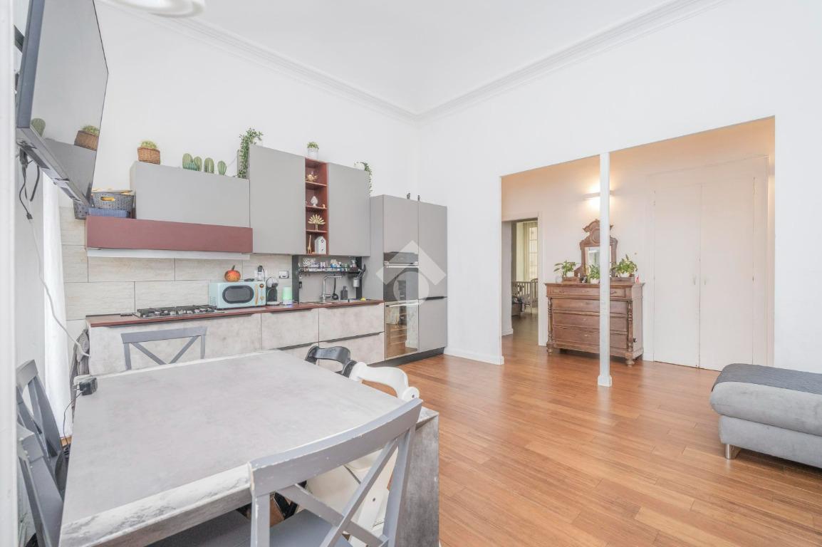 L'ingresso, da pianerottolo, si apre su un lungo disimpegno che conduce agli ambienti principali dell'abitazione. Da qui si accede direttamente all' ampio soggiorno con cucina a vista: un ambiente incantevole con soffitti imponenti e balcone su interno cortile.