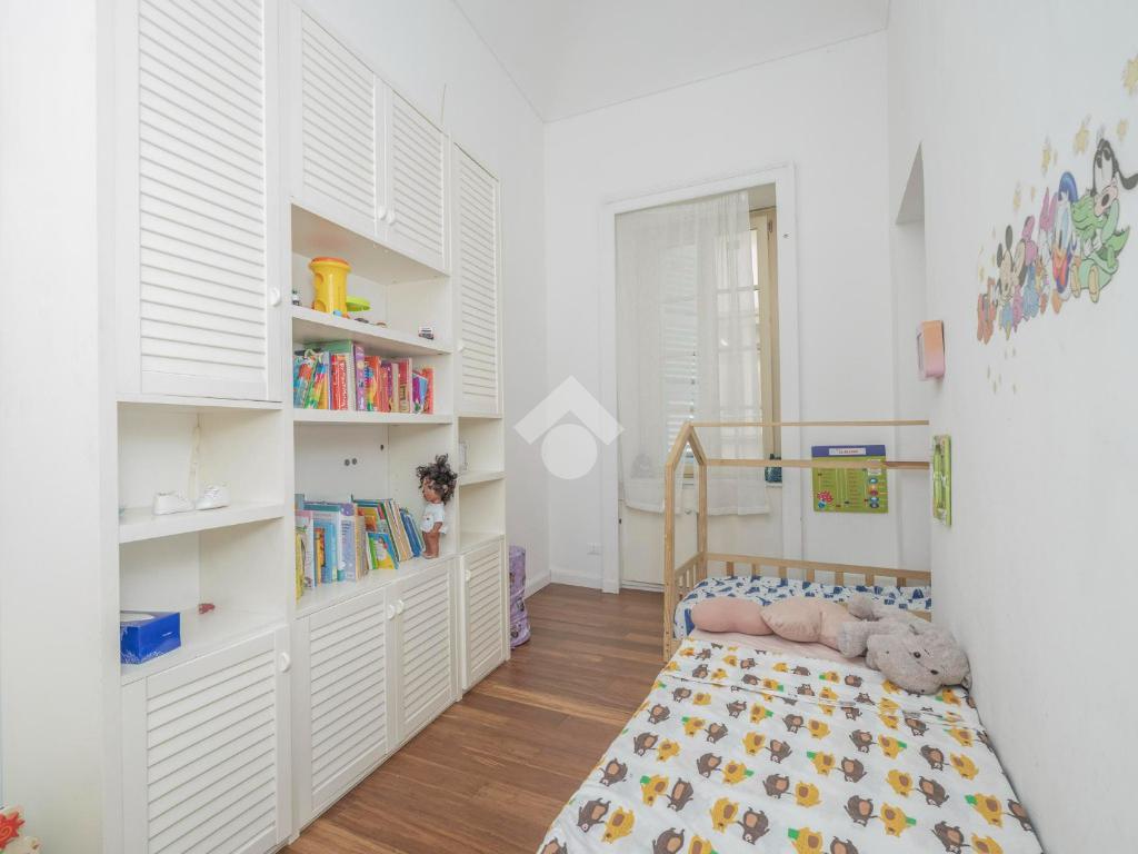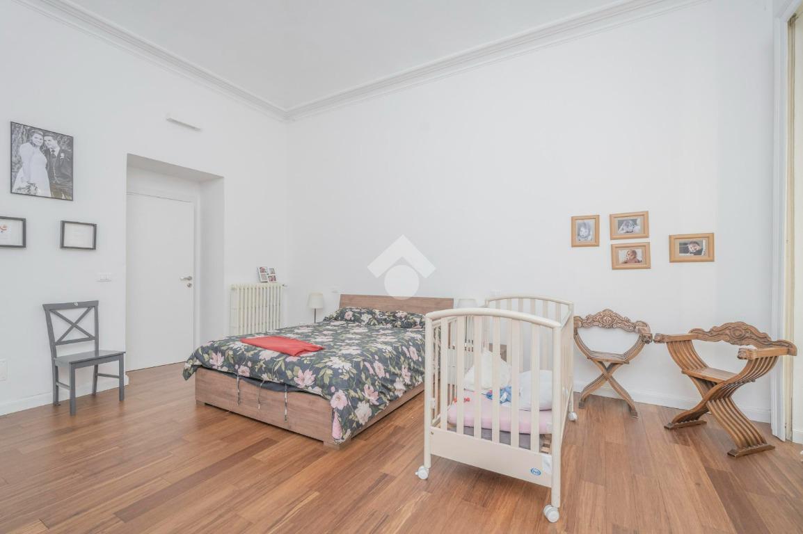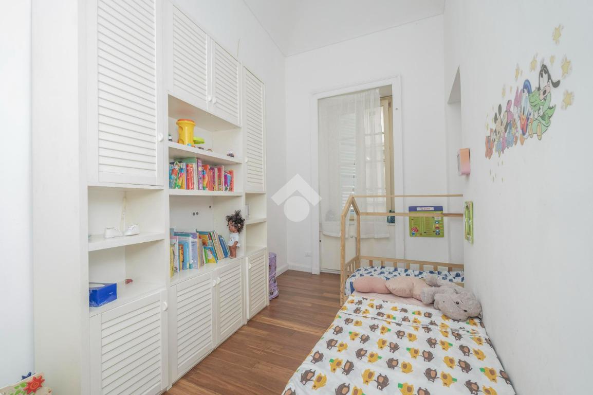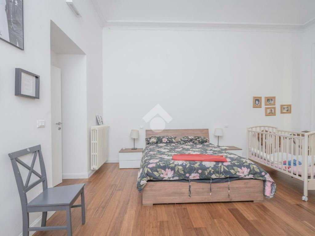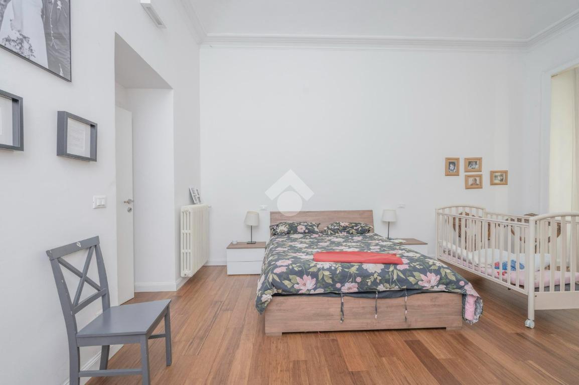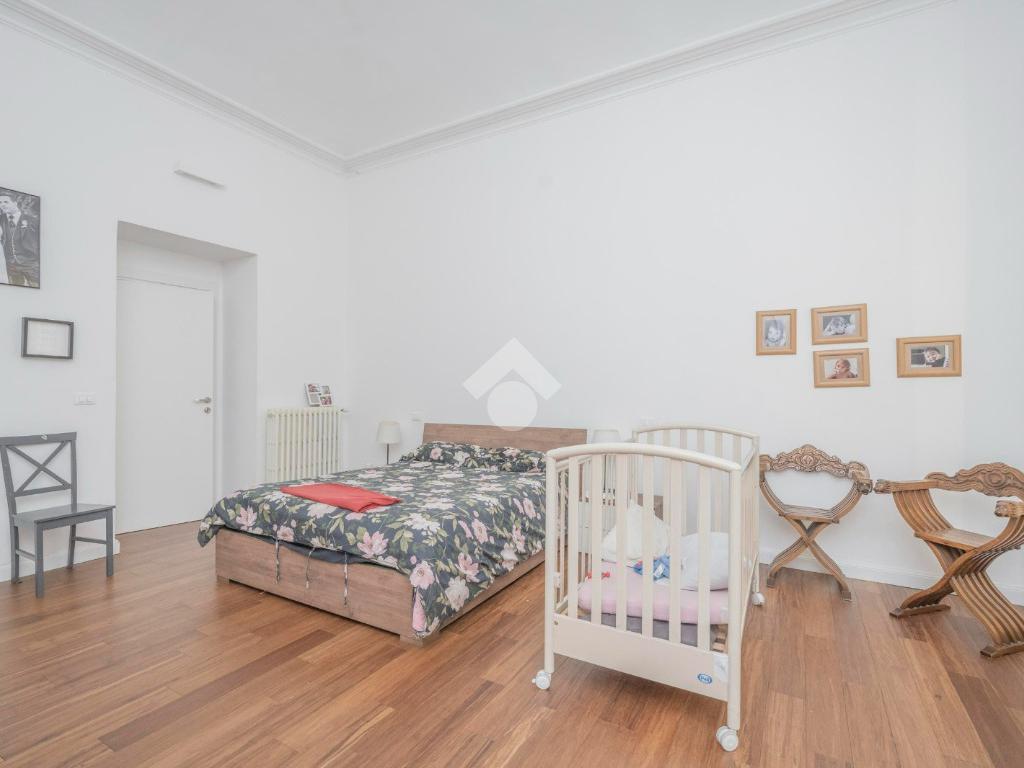 L'ingresso, da pianerottolo, si apre su un lungo disimpegno che conduce agli ambienti principali dell'abitazione. Da qui si accede direttamente all' ampio soggiorno con cucina a vista: un ambiente incantevole con soffitti imponenti e balcone su interno cortile.