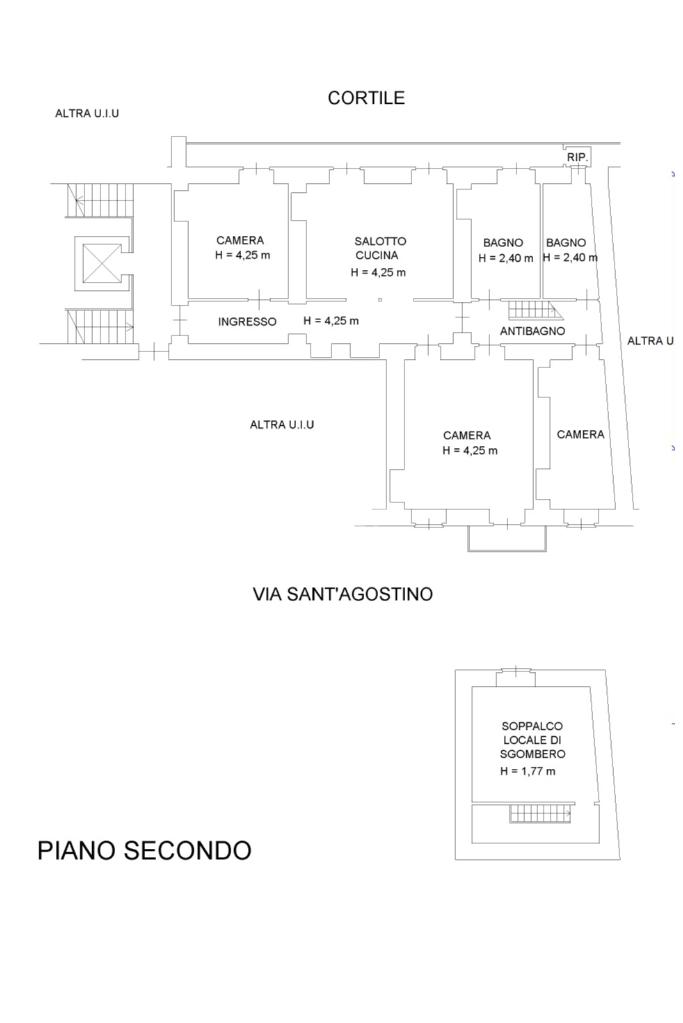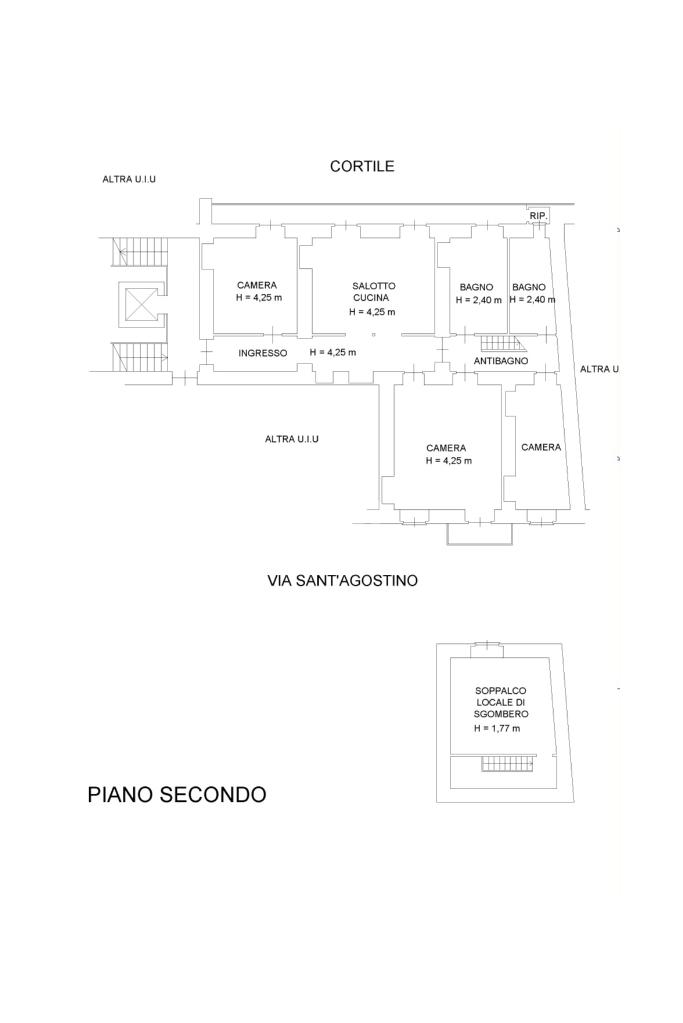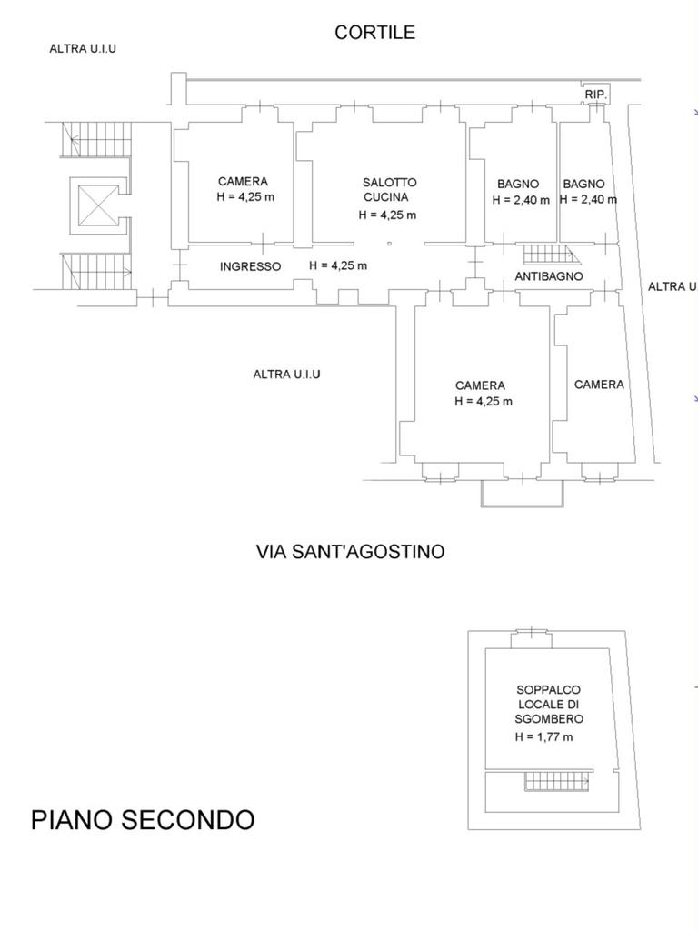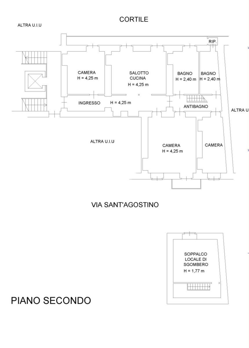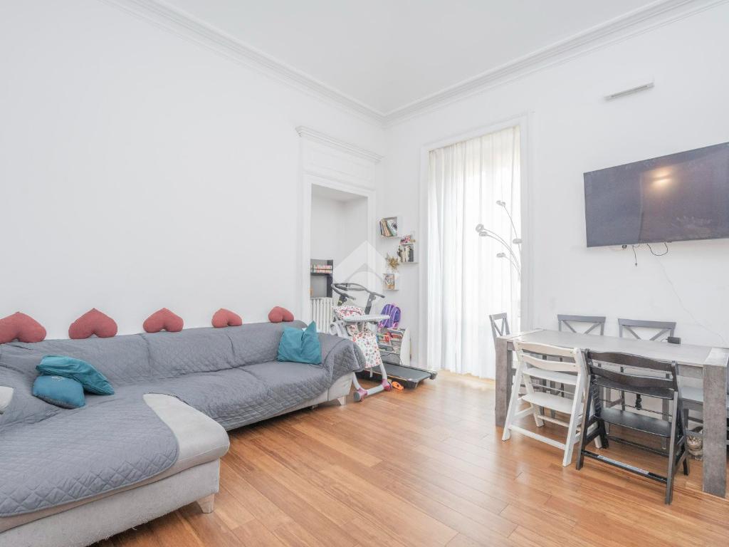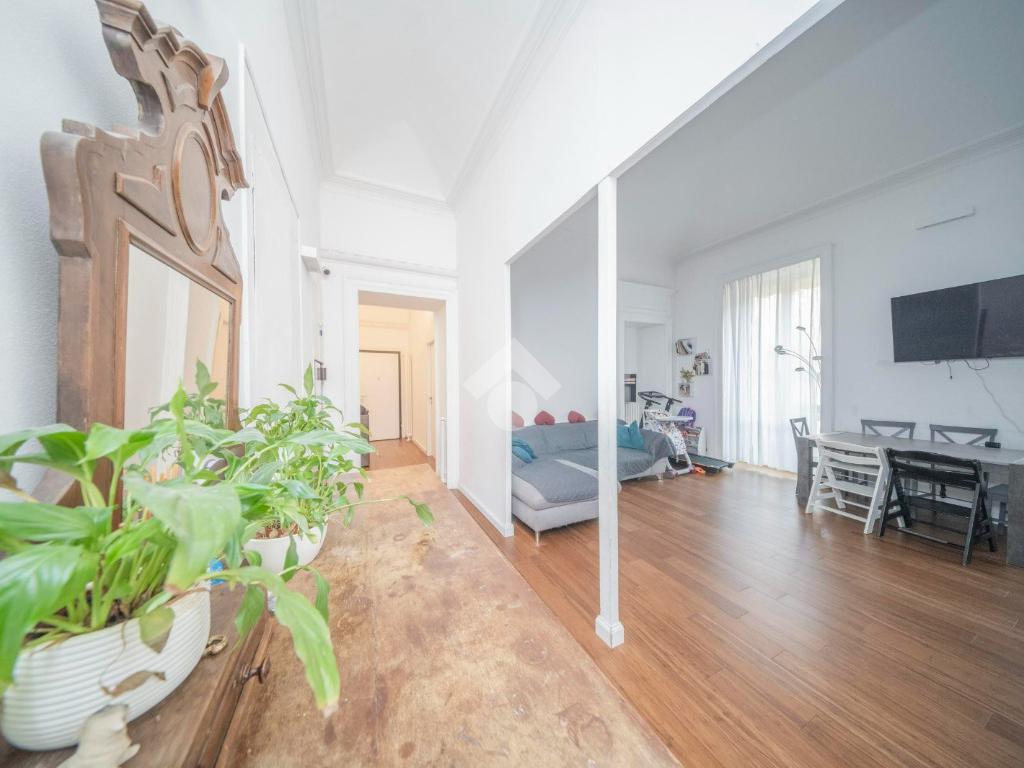 L'ingresso, da pianerottolo, si apre su un lungo disimpegno che conduce agli ambienti principali dell'abitazione. Da qui si accede direttamente all' ampio soggiorno con cucina a vista: un ambiente incantevole con soffitti imponenti e balcone su interno cortile.